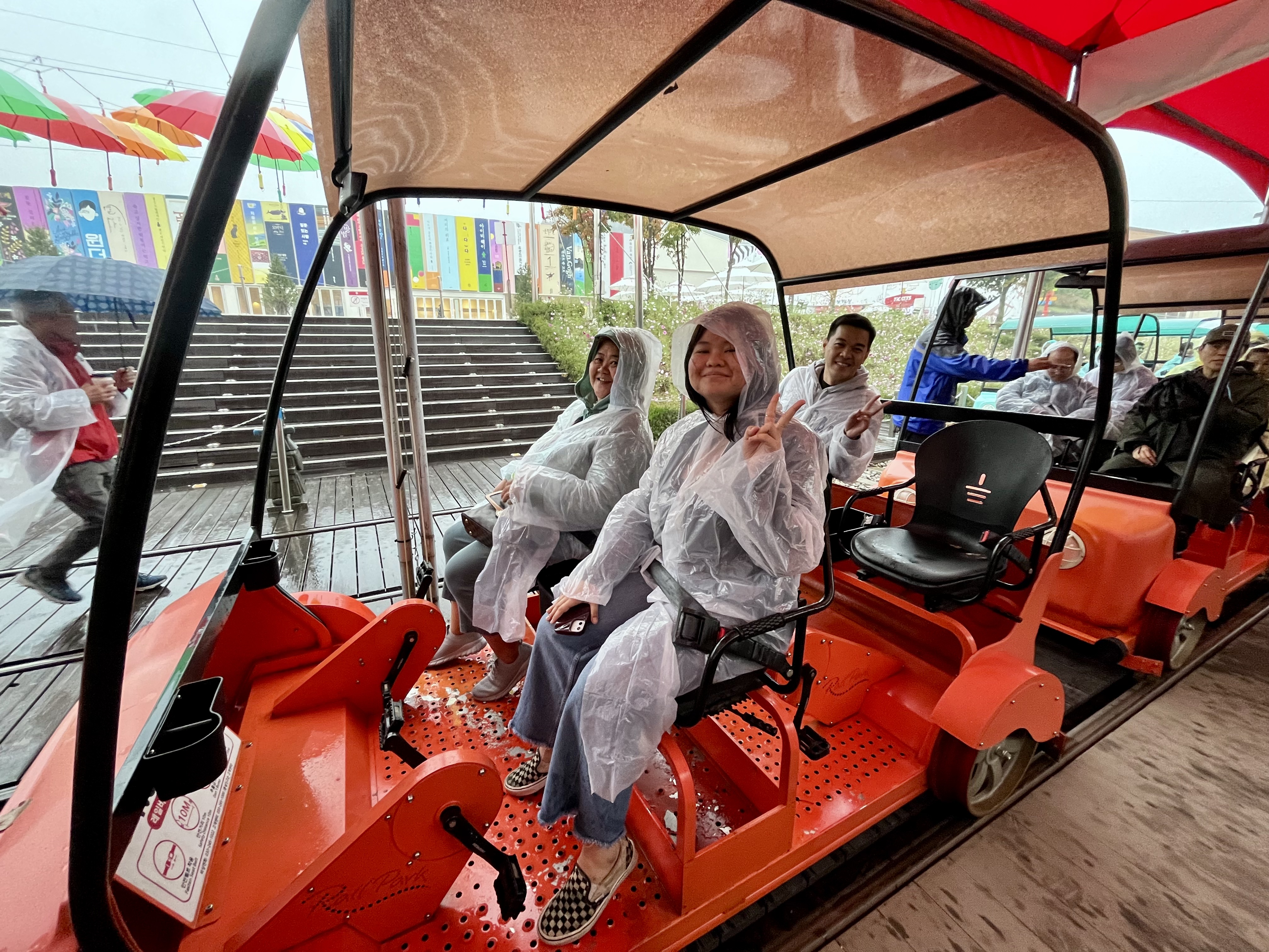 Our last stop is the Gangchon Rail Bike. The three of us pedaled along this old railway line, surrounded by mountains, rivers, and farmland. The scenery was breathtaking! We even passed through tunnels decorated with lights and music. It was raining the whole time, but we still had a lot of fun.