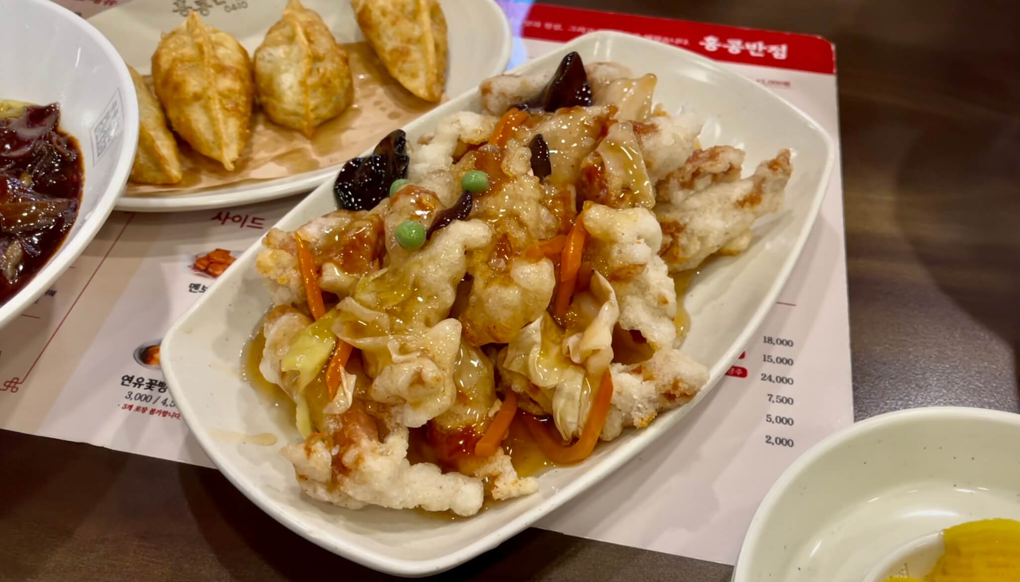 We also ordered Tangsuyuk—sweet and sour crispy pork, Jjamppong—a spicy seafood noodle soup, and some fried Mandu to complete the feast.