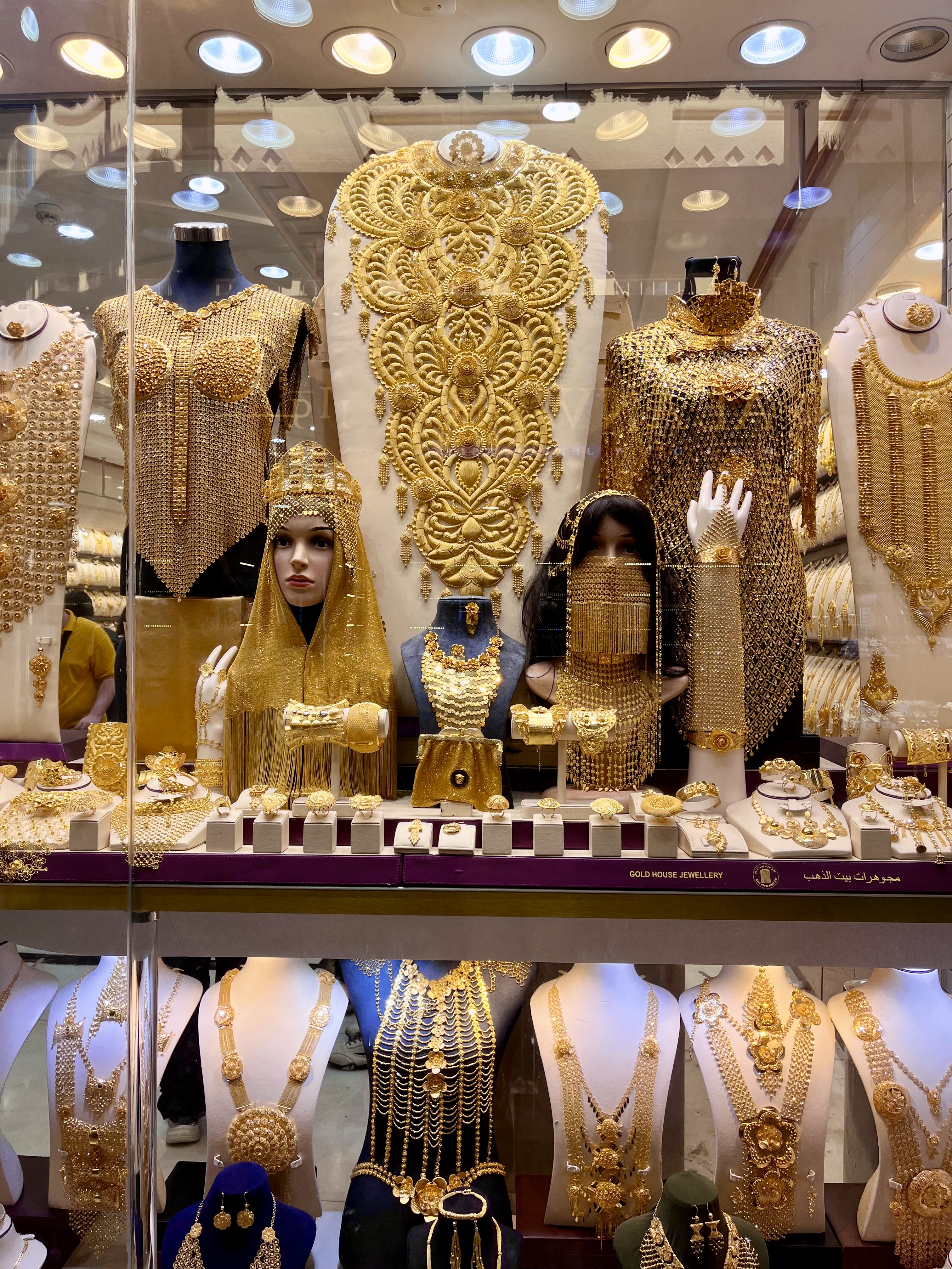 Our first stop is Dubai Gold Souk, a traditional market located in Deira with more than 380 retailers of gold, jewelry, and other precious metals. Here, you’ll be able to negotiate the price of gold down to just a fraction of what you normally pay at home. Where else in the world will you be able to haggle gold? They have everything in here, from simple engagement rings to intricately designed large gold sets.