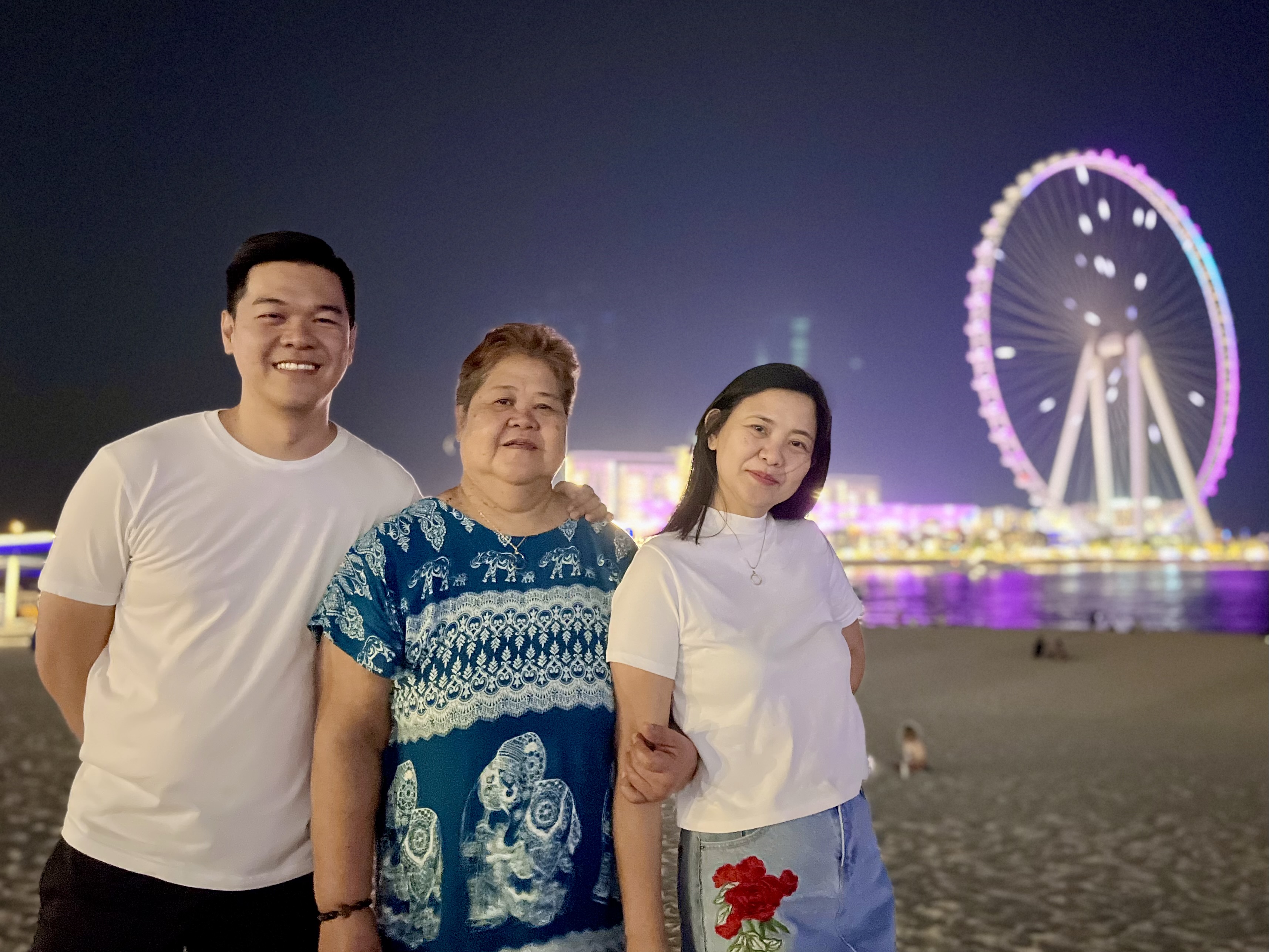 Later in the evening, we traveled to Marina Beach where we enjoyed the cool sea breeze and views of lit skyscrapers in the back and the nearby Blue Water Island and Ain Dubai in front of us.