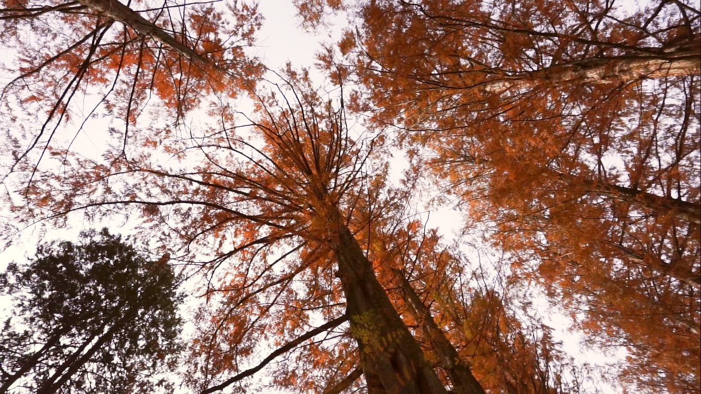 Hundreds of towering Dawn Redwood elegantly line a path that leads to the water at the end. Its leaves that have all turned to red, gold and orange create a warm and romantic ambience.